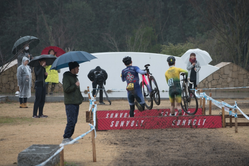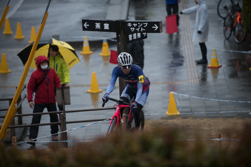 前日から降り続いた雨の影響でコース路面はドロドロ。競技中も雨は止まず状況はどんどん悪化。。コースは舗装スタートで直後に大きく曲がって短い上り。公園に入ってから未舗装区間となり、長めの階段上り、細かいアップダウン、タイトターンが多い芝生セクションと続く。コース終盤は公園を下りて、舗装の直線路でスタート地点に戻り、ラストは上りゴール。